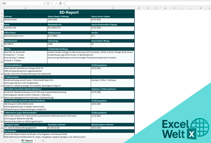 Die 8D-Report-Excelvorlage führt dich klar durch D1 bis D8 und hilft dir, Reklamationen strukturiert zu dokumentieren. Du trägst Daten, Maßnahmen und Termine direkt ein und behältst den Status schnell im Blick.