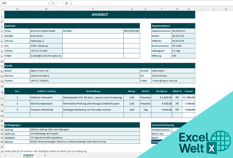 Die Vorlage ist so aufgebaut, dass du ein Angebot in Excel schnell ausfüllen und direkt verwenden kannst. Alle wichtigen Felder und Berechnungen sind klar angeordnet, damit du ohne Umwege arbeiten kannst.