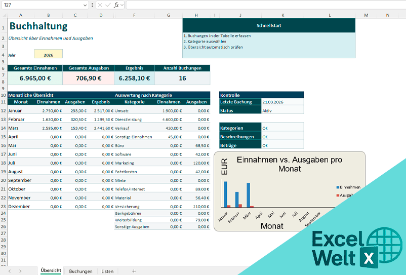 In der Übersicht siehst du monatliche Auswertungen automatisch, sodass du schnell erkennst, wie sich dein Ergebnis entwickelt. Das hilft dir vor allem dann, wenn du deine Buchhaltung mit Excel für ein kleines Unternehmen, als Freelancer oder für die Selbstständigkeit organisierst.