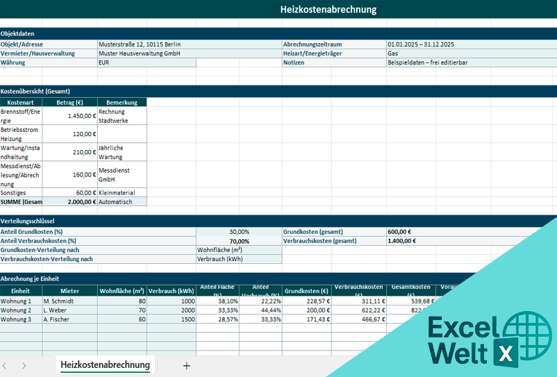 Diese Heizkostenabrechnung Vorlage verteilt Ihre Heizkosten automatisch nach Wohnfläche und Verbrauch. Sie tragen nur die wichtigsten Werte ein und sehen sofort Saldo sowie Nachzahlung oder Erstattung.