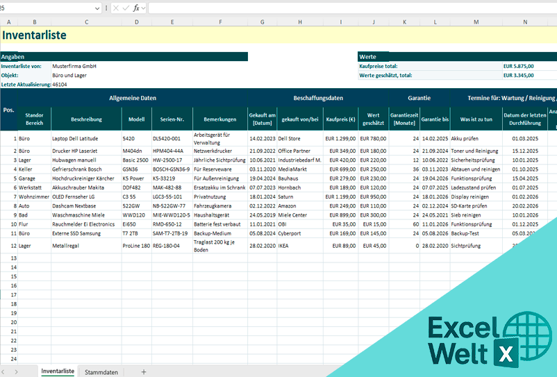 Die Datei ist so aufgebaut, dass du ohne lange Einarbeitung direkt starten kannst. In der Haupttabelle berechnet Excel bei der Inventarliste wichtige Werte wie Garantieende, nächste Fälligkeit und Summen automatisch, was dir bei Inventur, Dokumentation und Kontrolle viel Arbeit abnimmt.