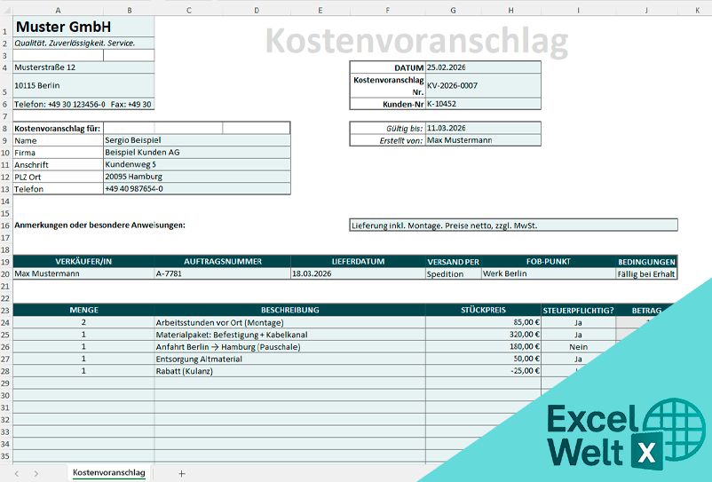 Kostenvoranschlag Excel Vorlage einfach ausfüllen