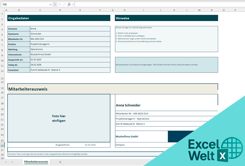 Die Vorlage ist so aufgebaut, dass du die wichtigsten Mitarbeiterdaten schnell eintragen und den Ausweis sofort prüfen kannst. Sie erleichtert die Nutzung, weil Eingabebereich und Vorschau klar getrennt sind und keine unnötigen Schritte nötig sind.
