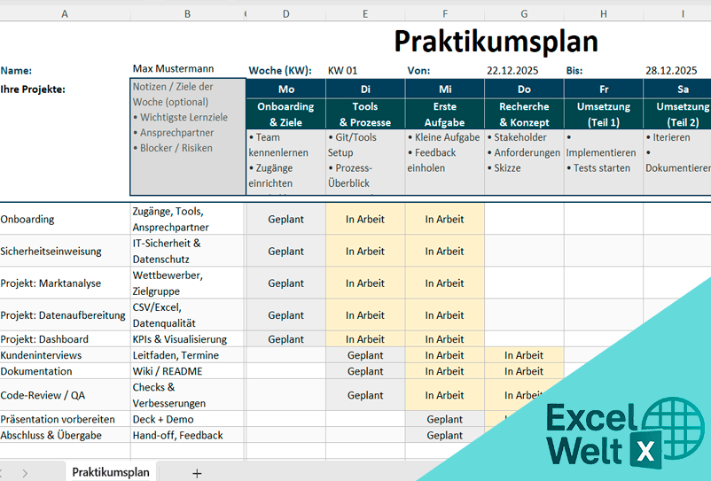 Diese Vorlage hilft Ihnen, Ihre Praktikumsaufgaben und Projekte übersichtlich nach Wochentagen zu planen und den Fortschritt schnell zu verfolgen.