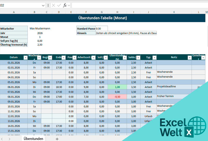 Überstunden Tabelle in Excel richtig ausfüllen